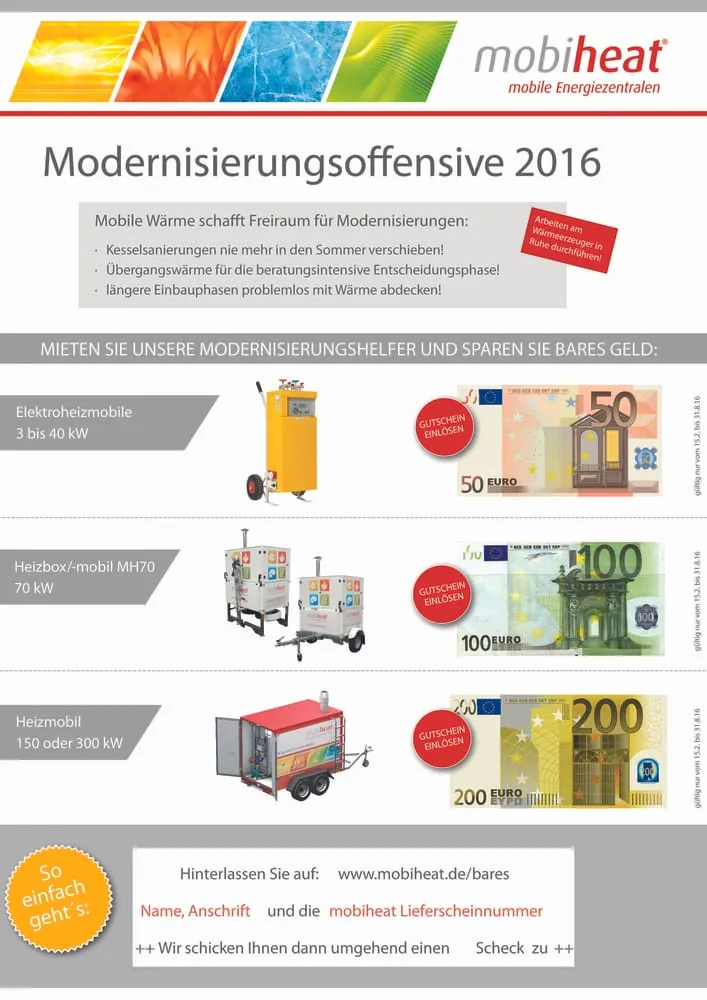 Aufgrund des guten Branchen-Feedbacks vor 3 Jahren gibt es jetzt eine Neuauflage der Modernisierungsoffensive bis zum 31.08.2016. Für den Mieteinsatz der mobilen Heizzentralen erhält jeder Kunde Schecks im Wert von 50, 100 oder 200 Euro.