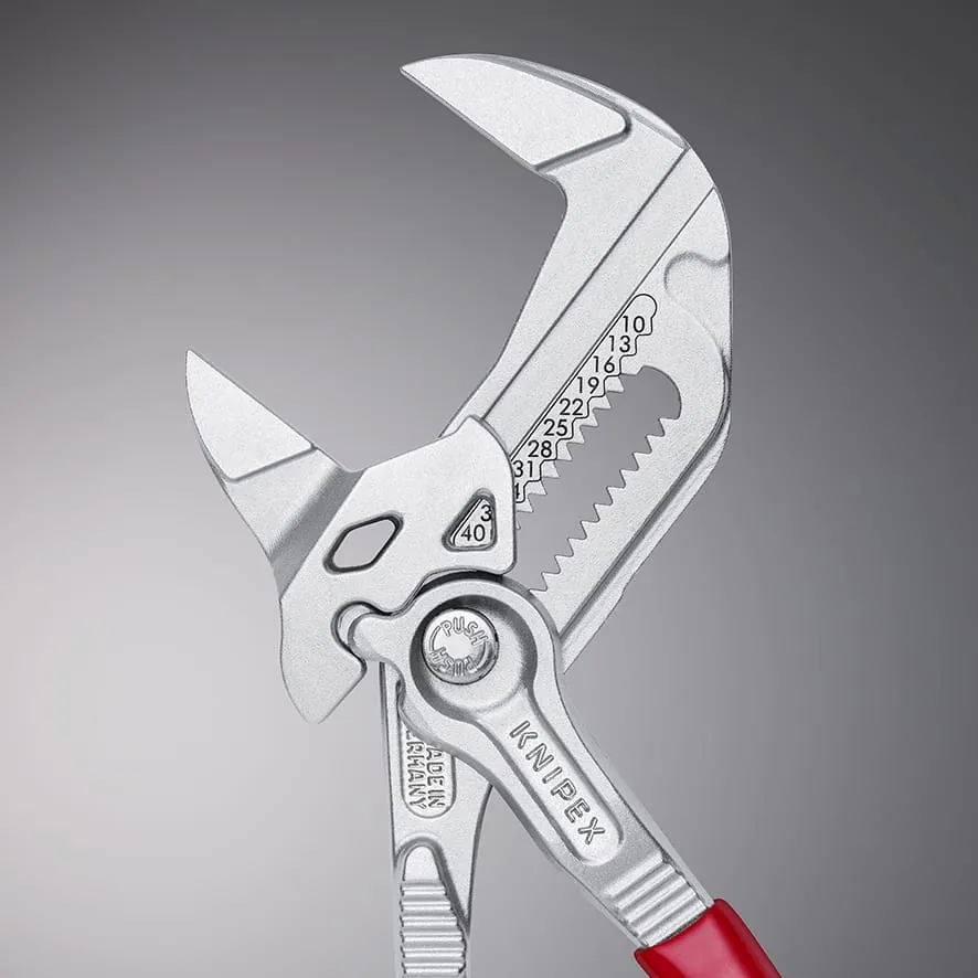 Der Zangenschlüssel des Wuppertaler Zangenherstellers Knipex ist ein echter Klassiker. Das Werkzeug, das Zange und Schraubenschlüssel in sich vereint, wurde umfassend modifiziert. Das 180 mm lange Modell ist leichter geworden und hat zwei zusätzliche Einstellpositionen für lückenloses Greifen bis 40 mm erhalten.