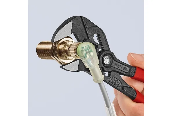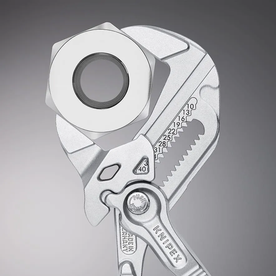 Der 86 180 Zangenschlüssel von Knipex ersetzt einen ganzen Satz metrischer oder zölliger Schraubenschlüssel – mit dem optimierten Modell sogar bis 40 Millimeter oder eineinhalb Zoll Greifkapazität. Dabei erfolgt das Verstellen der Greifbacken schnell per Druckknopf. Dank glatter, parallel geführter Backen können auch Verschraubungen mit empfindlichen Oberflächen, wie etwa Armaturen, schonend und beschädigungsfrei verschraubt werden. Zudem muss der Zangenschlüssel beim Lösen oder Festziehen von Schrauben nicht abgesetzt werden. Der Hub zwischen den Greifbacken ermöglicht einen Rückhub über die Schraubenecken und somit ein Schrauben nach dem Ratschenprinzip.