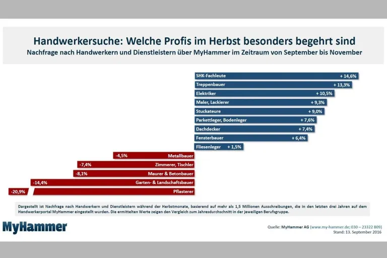 Fachkräfte aus dem Sanitär-, Heizungs- und Klimabereich werden im Zeitraum von September bis November besonders häufig von Verbrauchern angefragt. So liegt der ermittelte Bedarf an Handwerksleistungen in diesem Bereich rund 15 Prozent über dem Durchschnitt des Gesamtjahres. Treppenbauer (+13,3 Prozent), Elektriker (+10,5 Prozent) und Maler (+9,3 Prozent) profitieren ebenfalls von einer überdurchschnittlich hohen Nachfrage.