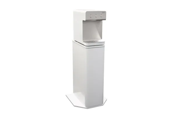 Eine automatische Spüleinrichtung, die lediglich einen Abwasseranschluss erfordert, sowie ein Sterilfilter sind als Zusatzausstattung erhältlich – ebenso ein passender Unterschrank, der mit dem Trinkwasserspender zu einer formschönen Einheit verschmilzt. Im Schrank finden diverse CO2-Flaschen Platz.
