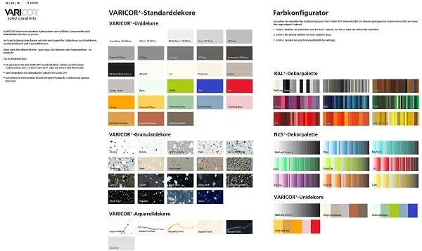 Mit Varicor ist nahezu jede Farbe möglich – ganz egal, ob unifarben, mit Granulatstruktur oder als Aquarelldekor, heißt es. Der Varicor-Farbkonfigurator ist ein hilfreiches Werkzeug, mit dem der Kunde sein individuelles Wunschdekor bereits am Bildschirm entwickeln kann. Entscheidet er sich, das Dekor umzusetzen, liefert Varicor innerhalb kürzester Zeit ein Labormuster – nach dessen Freigabe ist die Lieferfähigkeit kurzfristig gegeben, heißt es weiter.