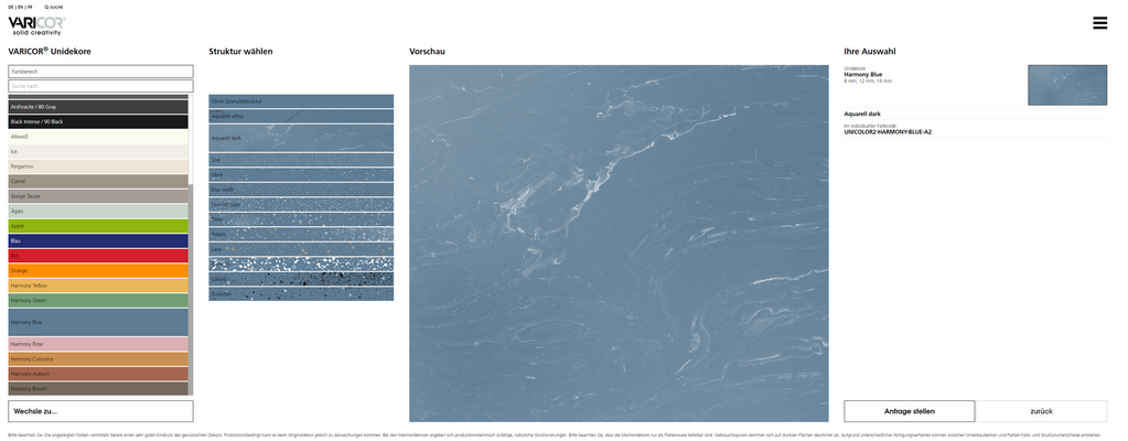 Mit Varicor ist nahezu jede Farbe möglich – ganz egal, ob unifarben, mit Granulatstruktur oder als Aquarelldekor, heißt es. Der Varicor-Farbkonfigurator ist ein hilfreiches Werkzeug, mit dem der Kunde sein individuelles Wunschdekor bereits am Bildschirm entwickeln kann. Entscheidet er sich, das Dekor umzusetzen, liefert Varicor innerhalb kürzester Zeit ein Labormuster – nach dessen Freigabe ist die Lieferfähigkeit kurzfristig gegeben, heißt es weiter.