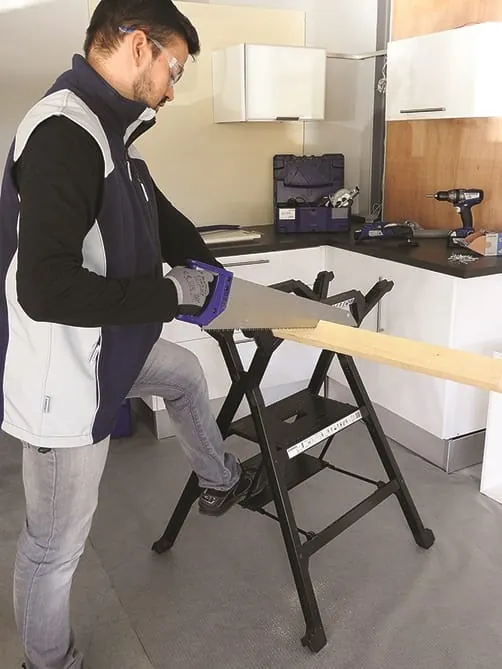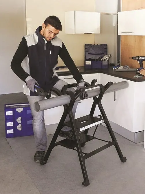 - Funktion 2: Staffelei (große Ablage), als Ablagehalterung zum Schneiden von großem Material wie PVC-Rohren oder Holzbalken.