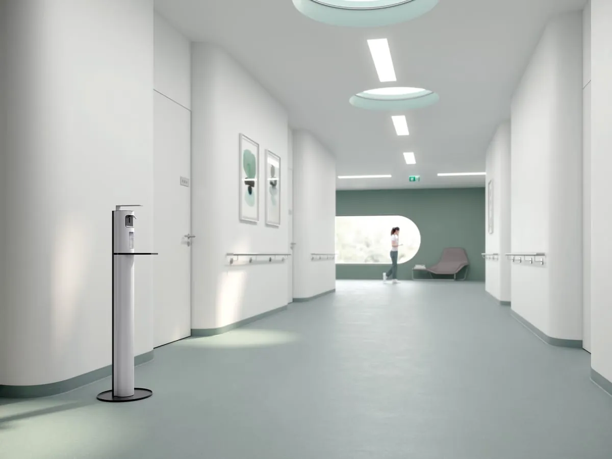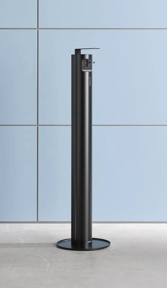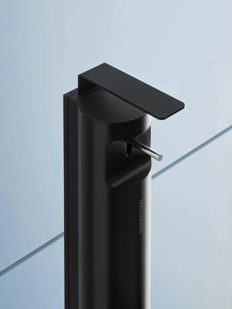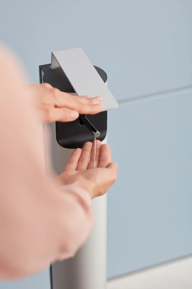 Der Desinfektionsmittelspender Plan überzeugt mit seiner Kombination von Design und Funktion im Eingangsbereich, am Fahrstuhl oder auf dem Flur. Er fügt sich in jede Umgebung und wird zum wichtigen Hygieneaccessoire überall dort, wo Menschen sich begegnen.