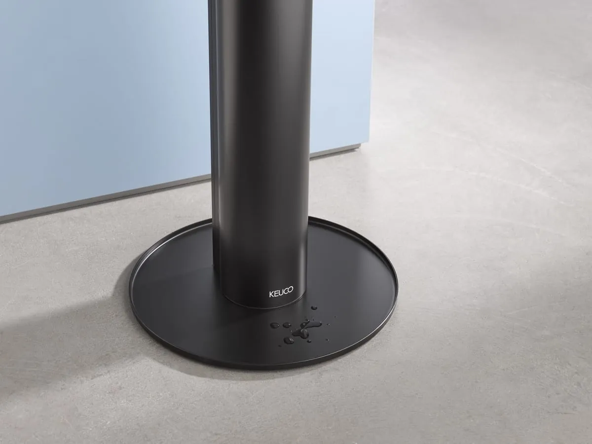 Mit seinem zurückhaltenden Äußeren in Silber-eloxiert/Schwarz oder Schwarz setzt er auf Understatement. Handelsübliches Desinfektionsmittel oder -gel wird einfach in die integrierte Vorratsflasche gefüllt. Die manuelle Betätigung ist hygienisch einwandfrei mit dem Unterarm praktikabel, erklärt der Hersteller. Als Abtropfschutz dient die großzügige Bodenplatte, die gleichzeitig einen festen Stand garantiert. Der Desinfektionsmittelspender ist auch als wandhängendes Modell und zusätzlich in verchromt und Edelstahlfinish erhältlich.