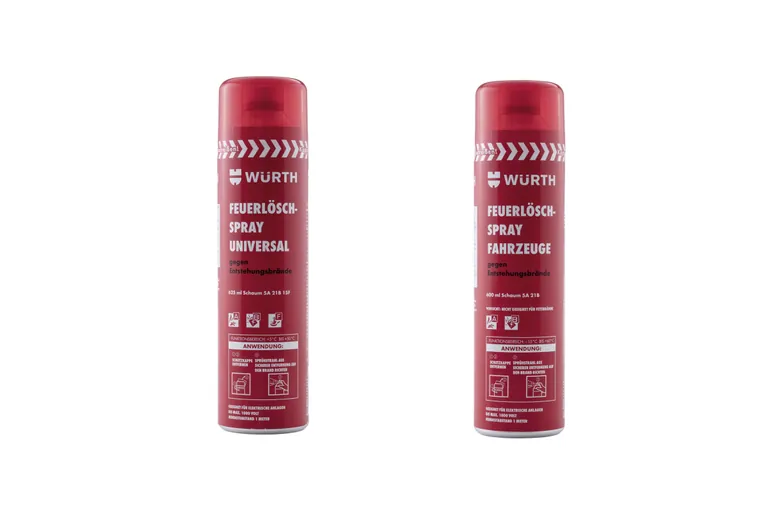 Mit dem Feuerlöschspray universal (links) und dem Feuerlöschspray Fahrzeuge lassen sich Entstehungsbrände als wirksame und zuverlässige Sofort-Maßnahme bekämpfen. – © Adolf Würth GmbH & Co. KG