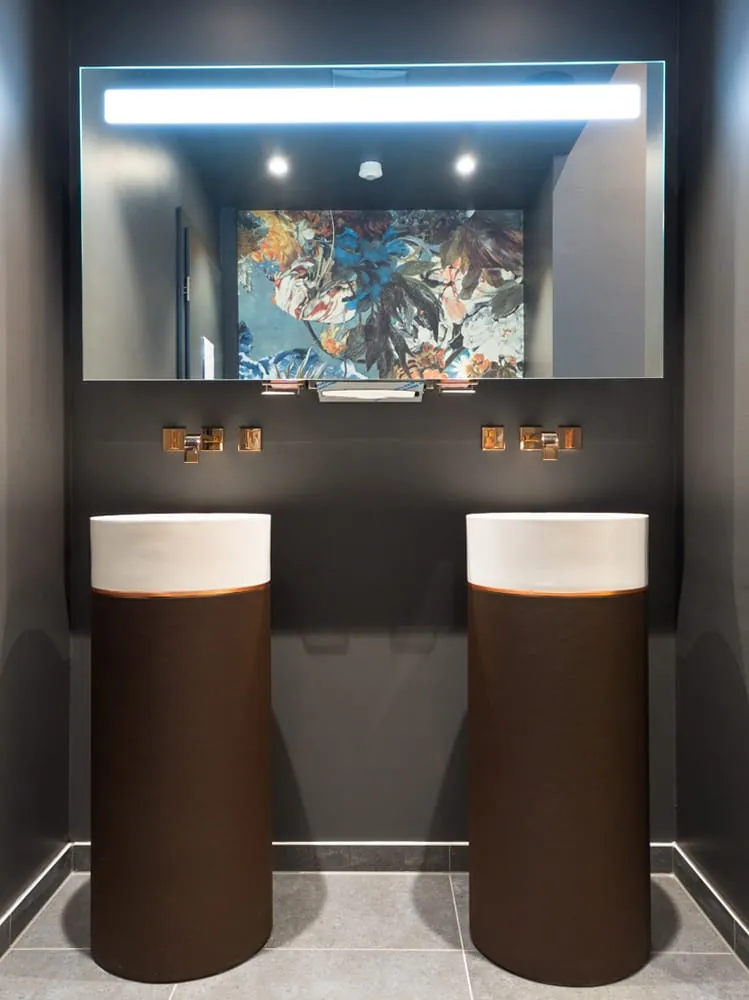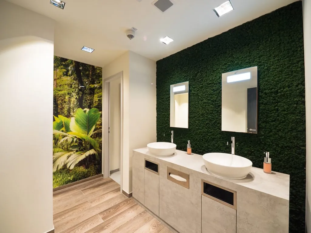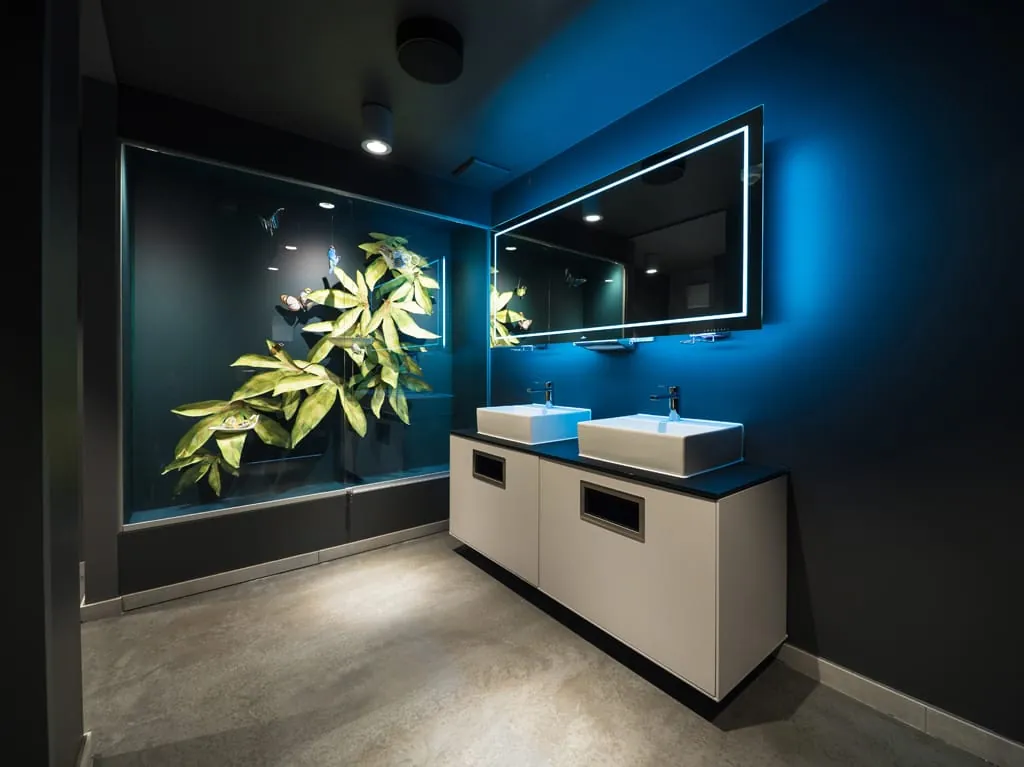 Ein gutes Beispiel für kreative Projektlösungen im Sanitär-Bereich sind die WC-Anlagen des Gebäudes: In Fabrik N°09 gleicht kein Toilettenraum dem anderen. Insgesamt gibt es sieben WC-Anlagen, die exklusiv mit Villeroy & Boch-Produkten ausgestattet sind und eigens für Fabrik N°09 in verschiedenen Themenwelten und mit dazu passender Musik inszeniert wurden: Energy-Boost-Räume mit kräftigen Farben oder im Metallic-Look, ein Zen Garten, ein Amazonia- oder ein Dschungel-Bad. Diese außergewöhnlichen Bad-Designs stehen beispielhaft für unkonventionelle Lösungen in öffentlichen Bereichen.