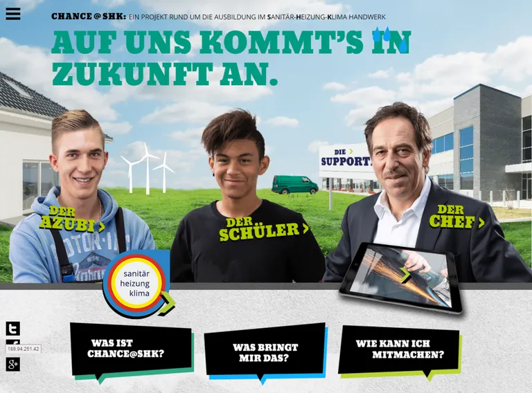 So wie das Projekt berufsnah Nachwuchsarbeit leistet, adressiert auch die Website der Chance@SHK gezielt seine Unterstützer: Schüler, SHK-Handwerksbetriebe und SHK-Auszubildende. Sie können sich über ihre Chancen kompakt in wenigen Klicks unter www.chance-shk-handwerk.de informieren und dann „Supporter“ der Initiative werden.