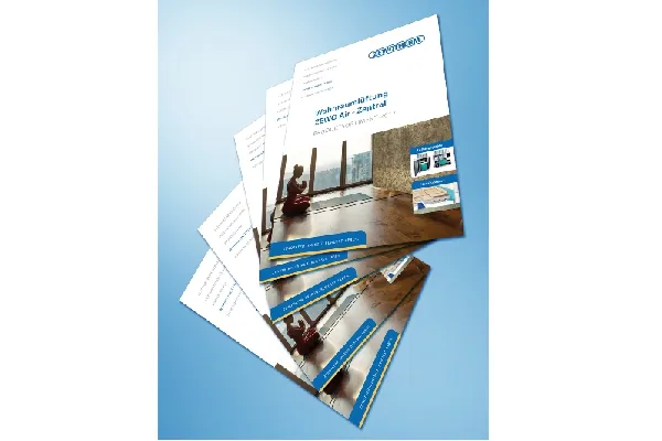 Für kompetente Beratungsgespräche werden in der neuen Verkaufsunterlage die Vorteile und die Funktionsweise der zentralen Lüftung anschaulich erklärt. Als Besonderheit wird ein System vorgestellt, bei dem das Kanalnetz in die Konstruktion der Fußbodenheizung integriert wird und mit 140 mm Höhe einen äußerst niedrigen Fußbodenaufbau zulässt.
