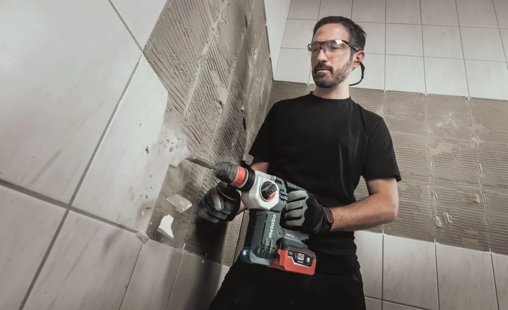 Mit kabelloser Freiheit zügig Fliesen entfernen oder staubarm in Beton bohren: Das bietet der neue 18-Volt-Bohrhammer KHA 18 LTX BL 24 Quick mit integrierter Staubabsaugung von Metabo.