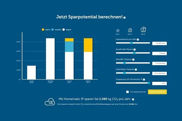 Ein Rechenbeispiel: Um eine 80m²-Wohnung mit drei Zimmern mit Homematic-IP-Heizkörperthermostaten, Wandthermostaten und Fensterkontakten auszustatten, muss ein Nutzer je nach Produktauswahl rund 500 € aufwenden. Bei einem angenommenen Gasverbrauch von 12.800 kWh und einem Gaspreis von 28 Cent pro kWh, wie im Oktober 2022, könnte sich diese Anschaffung laut den Ergebnissen des Rechners schon im ersten Jahr gänzlich amortisieren. Bereits im Folgejahr würde der Haushalt vollständig von den Einsparungen profitieren und 1.183 € sparen.