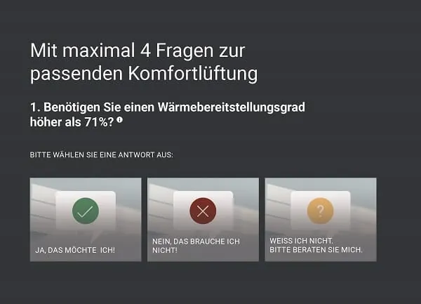 Das Online-Tool basiert auf dem Baukastenprinzip von Meltem, bei dem die Gerätetypen nach Leistungsarten, Steuerungsfunktionen und weiteren Komponenten bedarfsgerecht gewählt werden können. So funktioniert auch der Gerätefinder. Maximal vier Fragen sind zu beantworten, danach wird das passende Gerät vorgeschlagen. Die Fragen beziehen sich beispielsweise auf die Höhe des Wärmebereitstellungsgrades, die gewünschte Steuerungsart sowie auf sensorische Eigenschaften. Zur Präzisierung gibt es jeweils einen kurzen Erklär-Text – so kann der Finder auch ohne technisches Fachwissen einfach genutzt werden. Da sämtliche Antwortmöglichkeiten bereits vorgegeben sind, ist das Tool einfach zu bedienen. Unterstützend wirkt außerdem die Farbgestaltung nach dem Ampelsystem in grün, gelb und rot.