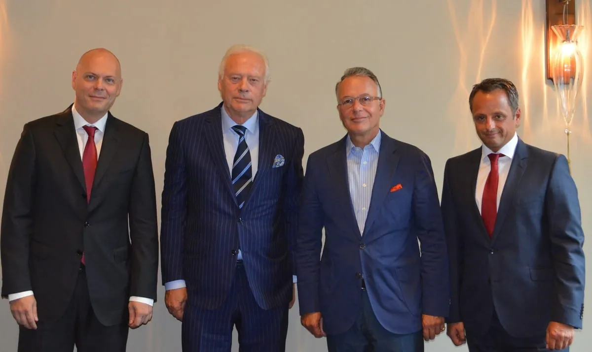 Bei der Vertragsunterzeichnung: Jobst Wagner, Präsident der Rehau Gruppe und zukünftiger Verwaltungsratsvorsitzender des neuen Unternehmens (Zweiter von rechts), Thomas Endres, derzeitiger Verwaltungsratspräsident MBT und zukünftiges Mitglied des Verwaltungsrats des neuen Unternehmens (Zweiter von links), Dr. Stefan Girschik, bisheriger stellvertretender CEO der Rehau Gruppe und zukünftiger CEO des neuen Unternehmens (rechts), und Philipp Endres, bisheriger CEO von MB Barter & Trading Holding AG (MBT) und zukünftiger stellvertretender CEO des neuen Unternehmens (links).