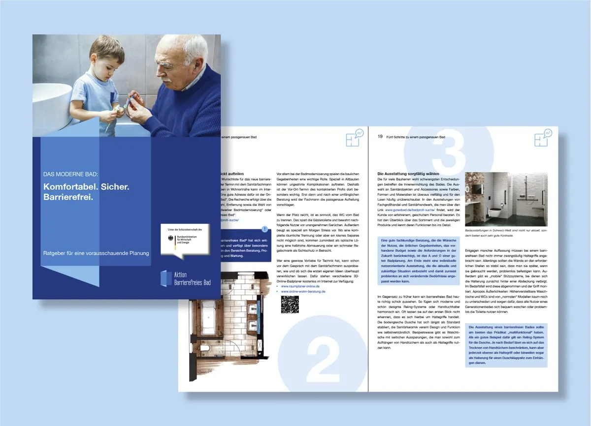 Ziel der Broschüre ist es zudem, ein konkretes systematisches Vorgehen beim barrierefreien Bad(um)bau zu ermöglichen. Daher bietet sie eingangs umfängliches Hintergrundwissen und zahlreiche Hinweise zur finanziellen Entlastung. Darüber hinaus nennt sie bundesweite Informationsstellen und gibt Bauherren, Modernisierern und Renovierern mit dem Kapitel „Fünf Schritte zu einem passgenauen Bad“ einen extra Leitfaden an die Hand.