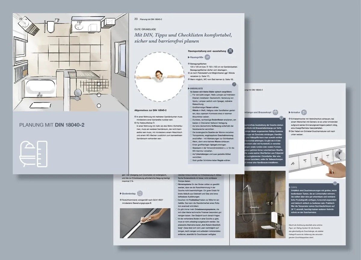„Das moderne Bad: Komfortabel. Sicher. Barrierefrei.“, so der Titel, vermittelt kompaktes Basiswissen zu den besonderen Anforderungen für die uneingeschränkte Nutzung. Das Fundament dafür liefert u. a. die DIN 18040-2. Die Planungshilfe führt ihre Vorgaben fürs Bad detailliert sowie mit wertvollen Tipps und Checklisten auf. Durch die Aufteilung in allgemeine und spezifische Informationen lässt sich dieser Bereich des 40-Seiters im A4-Format ebenfalls selektiv nutzen; etwa, wenn nur die Wanne gegen eine Dusche getauscht werden soll.