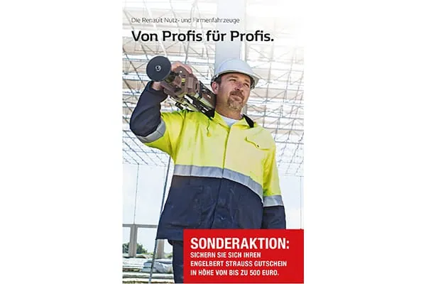 „Die gemeinsame Sonderaktion mit Renault und engelbert strauss ist ein absolutes Highlight, da passt einfach alles perfekt zusammen“, so Ralf Baumeister, Geschäftsführer der SDH. Das Unternehmen ist ein Ansprechpartner für Handwerker rund um das Thema Mobilität. Mit Renault kooperiert die SDH nach eigenen Angaben bereits seit Jahren erfolgreich. Ein weiterer Partner ist seit 2015 das inhabergeführte Familienunternehmen engelbert strauss, ein Hersteller, Versand- und Einzelhandelsunternehmen für Arbeitskleidung und -zubehör, Schuhe sowie Arbeitsschutz.