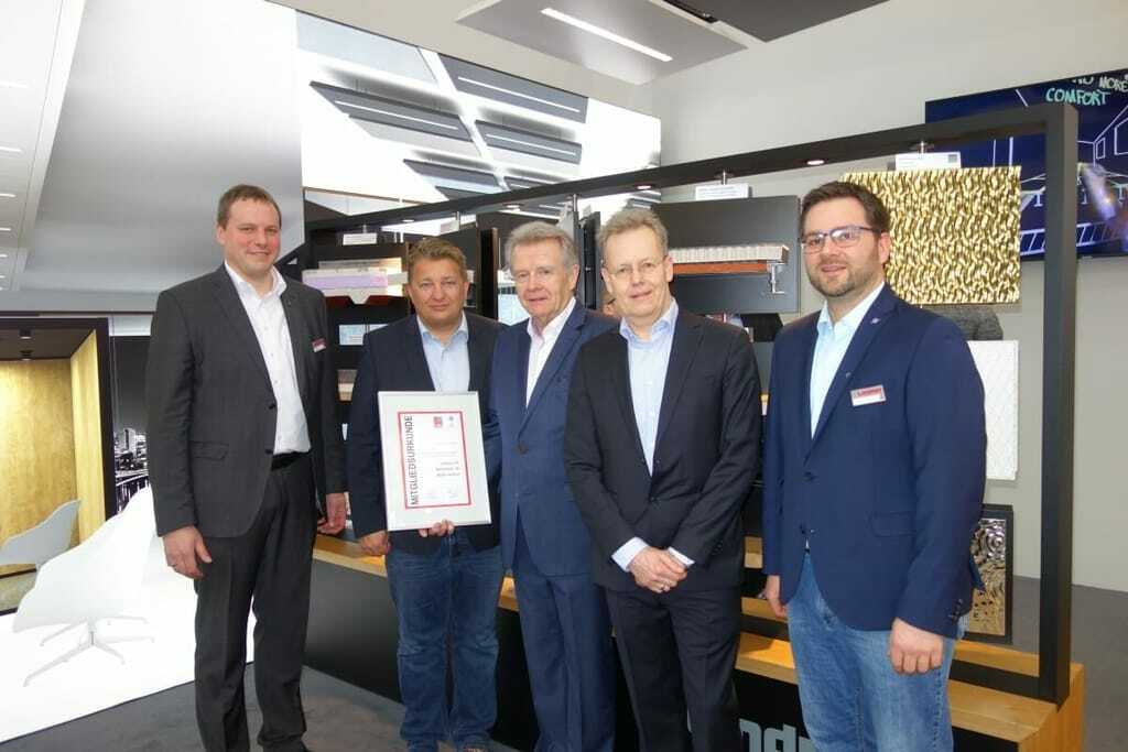 Die offizielle Mitgliedsurkunde der Lindner AG wurde im Rahmen der ISH 2019 durch Ulrich Stahl, Vorstandsvorsitzender des BVF e. V. sowie Axel Grimm, Geschäftsführer des BVF e. V., überreicht.