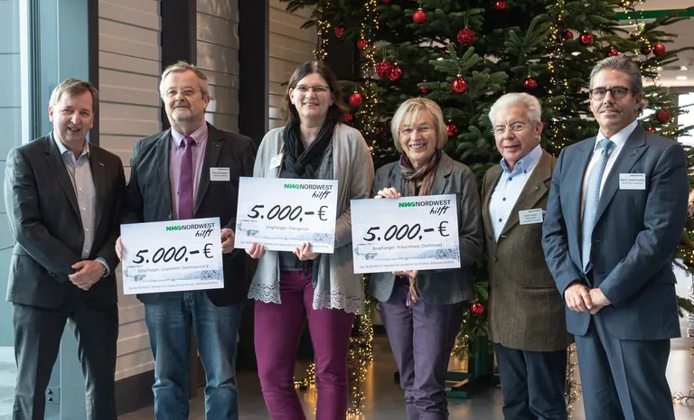 Interims-Vorstandsvorsitzender Martin Bertinchamp und Finanzvorstand Jörg Simon übergaben drei sozialen Organisationen die Spenden im Wert von jeweils 5000 Euro: dem Frauenhaus der Stadt Dortmund, dem Verein Löwenherz und Passgenau, einer Initiative der Dortmunder Diakonie.