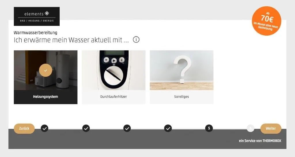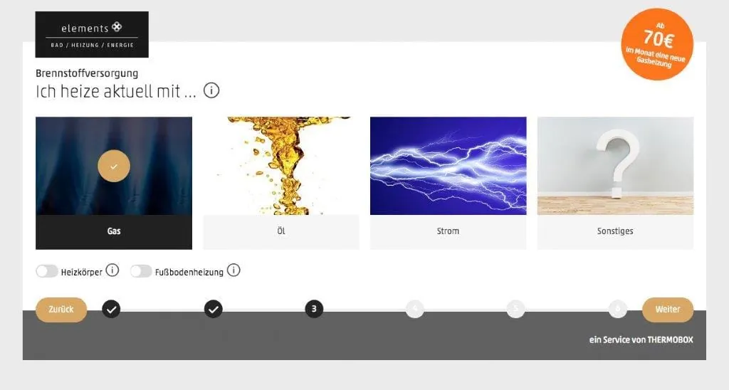 Der Endverbraucher soll zunächst über die Webseite www.elements-show.de/heizungskonfigurator in die digitale Heizungswelt geführt werden. Dort soll er fundierte Inhalte finden, um sich über das Thema Wärme und energieeffiziente Lösungen zu informieren. Über den auf der Webseite aufrufbaren Heizungskonfigurator kann er sich mit wenigen Klicks und in nur fünf Minuten eine Angebotsübersicht zu verschiedenen Wärmeerzeugungsanlagen anzeigen lassen. Technisch möglich macht diesen Service das Heizungs-Tool Thermobox der Gemeinschaft für Energieeffizienz, mit der Elements kooperiert.