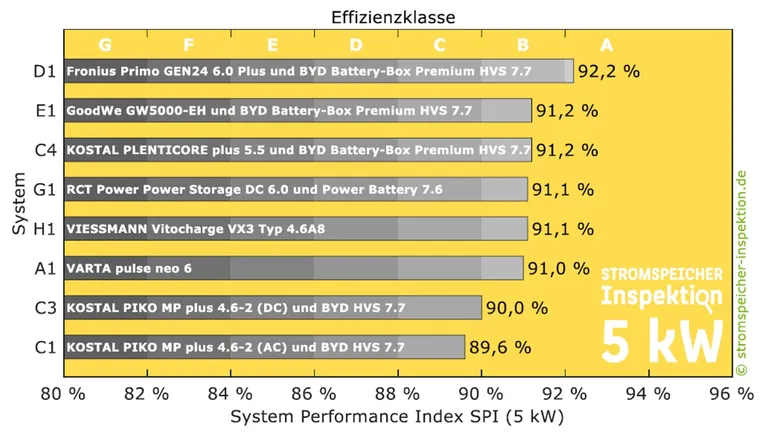 Den höchsten SPI im Referenzfall 5 kWp erreichte der Primo GEN24 6.0 Plus gemeinsam mit der BYD Battery-Box Premium HVS 7.7. Mit 92,2 % liegt das PV-Speichersystem um einen ganzen Prozentpunkt vor dem Zweitplatzierten. Im Referenzfall 10 kWp erreichte der Symo GEN24 10.0 Plus mit der BYD Battery-Box Premium HVS 10.2 einen SPI von 94,7 %.