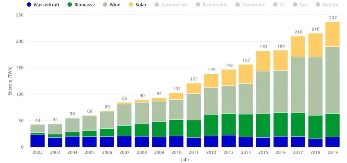 In Summe produzierten die erneuerbaren Energiequellen im Jahr 2019 ca. 237 TWh Strom (+ 7 % gegenüber 2018) und lagen damit vor den fossilen Energiequellen (207 TWh).