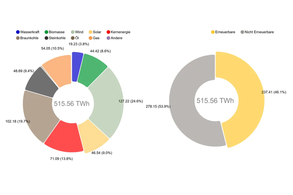 Der Anteil der erneuerbaren Energien an der Nettostromerzeugung (Strommix, der tatsächlich aus der Steckdose kommt) hat sich von 40,6 % auf 46 % erhöht. Damit liegen sie zum ersten Mal in der Summe vor den fossilen Energieträgern (40 %). Die Windkraft verzeichnete mit 17,3 TWh den größten Zuwachs und die Braunkohle mit -29,3 TWh die stärksten Verluste.