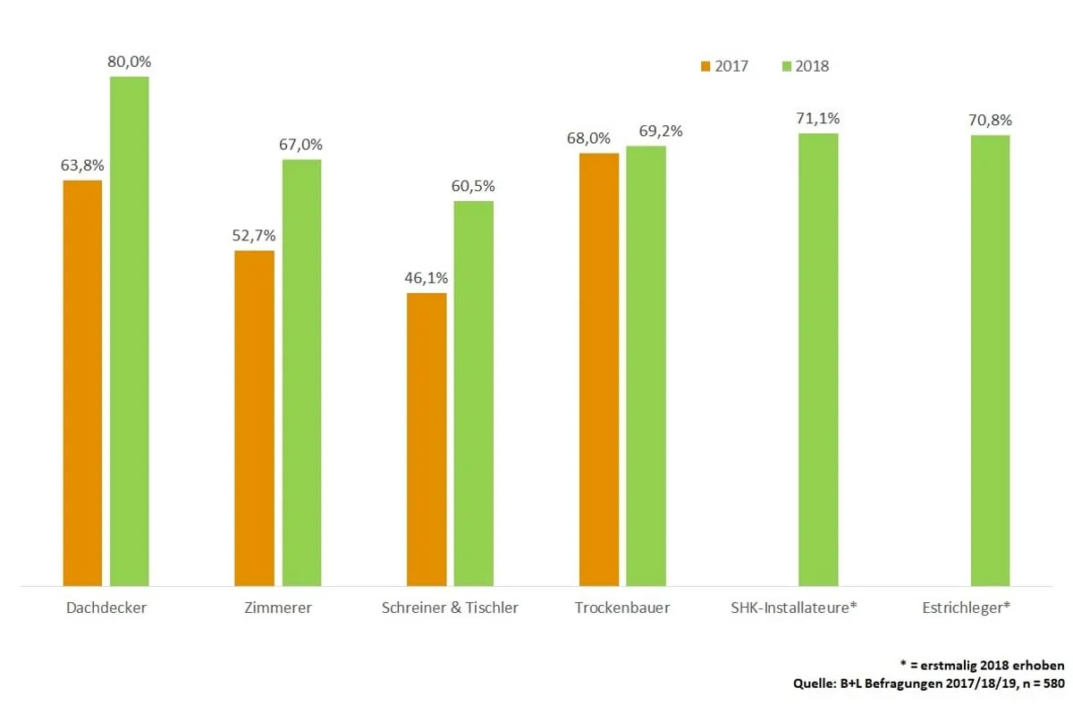 Um die Auslastung der Verarbeiter zu quantifizieren, hat das Marktforschungsinstitut B+L im Februar und März 2019 die 3. Welle ihres Kapazitätenpanels durchgeführt. In der aktuellen Welle haben 71,1 % der Verarbeiter angegeben, dass sie im Jahr 2018 Aufträge aufgrund fehlender Kapazitäten abgelehnt haben. Mit Ausnahme der Trockenbauer ist die Ablehnungsquote im Vergleich zum Jahr 2017 in allen Gewerken gestiegen. So haben beispielsweise SHK-Unternehmer 2018 71,1 % der Aufträge ablehnen müssen, hier gibt es keine Vergleichswerte zu 2017, da diese erst 2018 in die Auswertung aufgenommen wurden. Bei Dachdeckern stieg die Ablehnung von Aufträgen aufgrund einer zu hohen Auslastung um +16,2 % von 63,8 % im Jahr 2017 auf 80 % im Jahr 2018. Ebenso stieg die Quote bei Zimmerern sowie Schreinern und Tischlern.