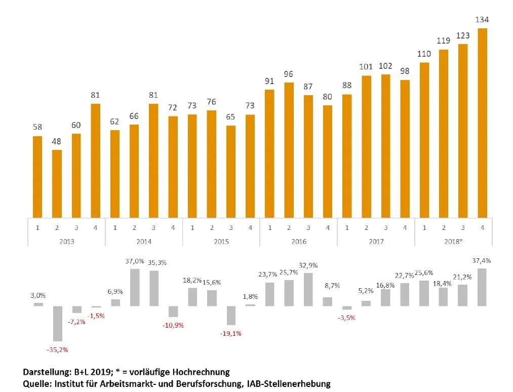 Angesichts dieser Ergebnisse stellt sich die Frage nach Kapazitätsausweitungen bei den Betrieben. Der Arbeitsmarktreport 2019 des Deutschen Industrie- und Handelskammertags (DIHK) beschreibt einen Mangel an qualifizierten Bewerbern im Bauhandwerk. Dies hat auch die aktuelle B+L Erhebung ergeben. Mehr als 1/3 der Betriebe wollten die Kapazitäten im vergangenen Jahr ausweiten, haben jedoch keine qualifizierten Mitarbeiter am Arbeitsmarkt gefunden. Dieses Ergebnis ist wenig überraschend wie ein Blick auf die Stellenerhebung des Instituts für Arbeitsmarkt- und Berufsforschung zeigt.