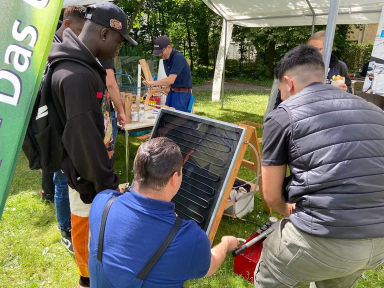 Daher organisierte die Berliner Innung gemeinsam mit den Berliner Elektro-, Maler-, Schornsteinfeger- und KFZ-Innungen sowie dem Lehrbauhof Berlin und mit Unterstützung der Ausbildungsinitiative #seiDUAL sowie der Senatsverwaltung für Integration, Arbeit und Soziales, der Agentur für Arbeit und Masterplan Solarcity am 14. Juni 2022 zum zweiten Mal den Berufsorientierungstag „Zukunft Handwerk“. Rund 120 Schülerinnen und Schüler der Jahrgangsstufen 9-10 informierten sich im SHK-Kompetenzzentrum Berlin über duale Ausbildungsberufe.