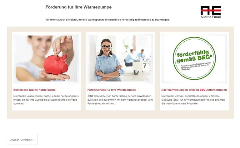 In Deutschland gibt es über 1.000 Förderungen für Wärmepumpen. Um je nach Ort und Region die passenden Fördermittel zu finden, bietet Austria Email einen praktischen Online-Föderberater an.