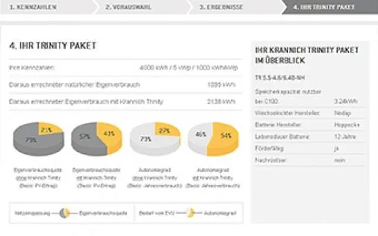 Im Krannich Solar WebPortal gibt es den Trinity Konfigurator. Krannich Trinity ist das Speichersystem für PV-Anlagen mit einer Leistung von 3 kWp bis zu 17 kWp des Unternehmens. Die Pakete sind unabhängig von Hersteller und Typ für optimale Effizienz und nach Kompatibilität zusammengestellt. Hier können Fachpartner mittels der Ihnen vorliegenden Kundeninformationen über angestrebte PV-Leistung und Jahresstromverbrauch das passende Trintity Paket mit den geeigneten Komponenten online konfigurieren. Als Ergebnis wird eine Auswahl an in Frage kommenden Paketen aufsteigend nach Autonomiegrad aufgelistet. Das gewünschte Paket wird mit einem Klick in den Warenkorb des WebPortal gelegt und online bestellt. Der Installateur kann auf diese Weise die optimale Lösung ermitteln und seinem Kunden vorschlagen und anbieten. Dieses Tool ist eines der umfangreichsten Online Konfigurationstools für Speichersysteme, das für Installateure entwickelt wurde, da eine sehr große Vielfalt an Lösungen zur Auswahl steht. Diese setzen sich aus hochwertigen Komponenten namhafter Hersteller für Speichersysteme zusammen. Bei individuellen Fragen steht das Vertriebsteam dem Installateur persönlich zur Verfügung.