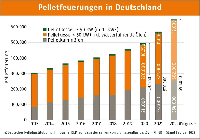 Der Zubau an Pelletfeuerungen in Deutschland erfolgte im Jahr 2021 mit einer bislang nicht bekannten Dynamik. 86.500 neue Feuerungen wurden installiert. Im Vorjahr waren es 61.850 (plus 40 %). Über 61.000 dieser Anlagen sind Pelletzentralheizungen und wasserführende Pelletkaminöfen bis zu einer Leistung von 50 Kilowatt (kW), die vor allem zum Ersatz von Ölheizungen in Ein- und Zweifamilienhäusern eingesetzt werden. Gefolgt werden sie von 24.000 luftgeführten Pelletkaminöfen und knapp 1.200 größeren Heizkesseln/KWK-Anlagen (> 50 kW). Letztere werden für Wärmenetze oder auch für Prozesswärme in Gewerbe und Industrie genutzt.