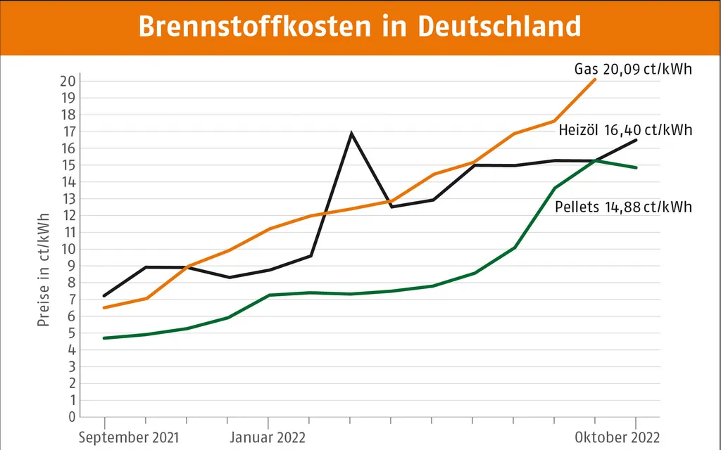 Der Pelletpreis gehe trotz weiterhin sehr hohen Rohstoffkosten etwas zurück und beträgt im Oktober durchschnittlich 743,81 Euro/Tonne (t), bei einer Abnahme von 6 t. Das sind 2,6 % weniger als im Vormonat und 199,8 % mehr als im Oktober 2021, berichtet das Deutsche Pelletinstitut (DEPI). 1 kWh Wärme aus Pellets liegt bei 14,88 ct/kWh, das entspricht rd. 9 % Preisvorteil zu Heizöl und rd. 26 % zu Erdgas.