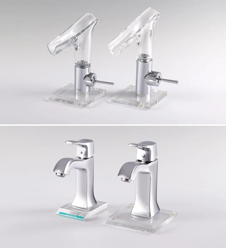 Links die Waschtischmischer „AXOR Starck V“ und „Metris Classic“ von Hasgrohe, rechts die chinesischen Plagiate von Taizhou Ranbo Sanitary Ware Co. Ltd. und Heshan Khone Sanitary Ware Technology Co. Ltd..