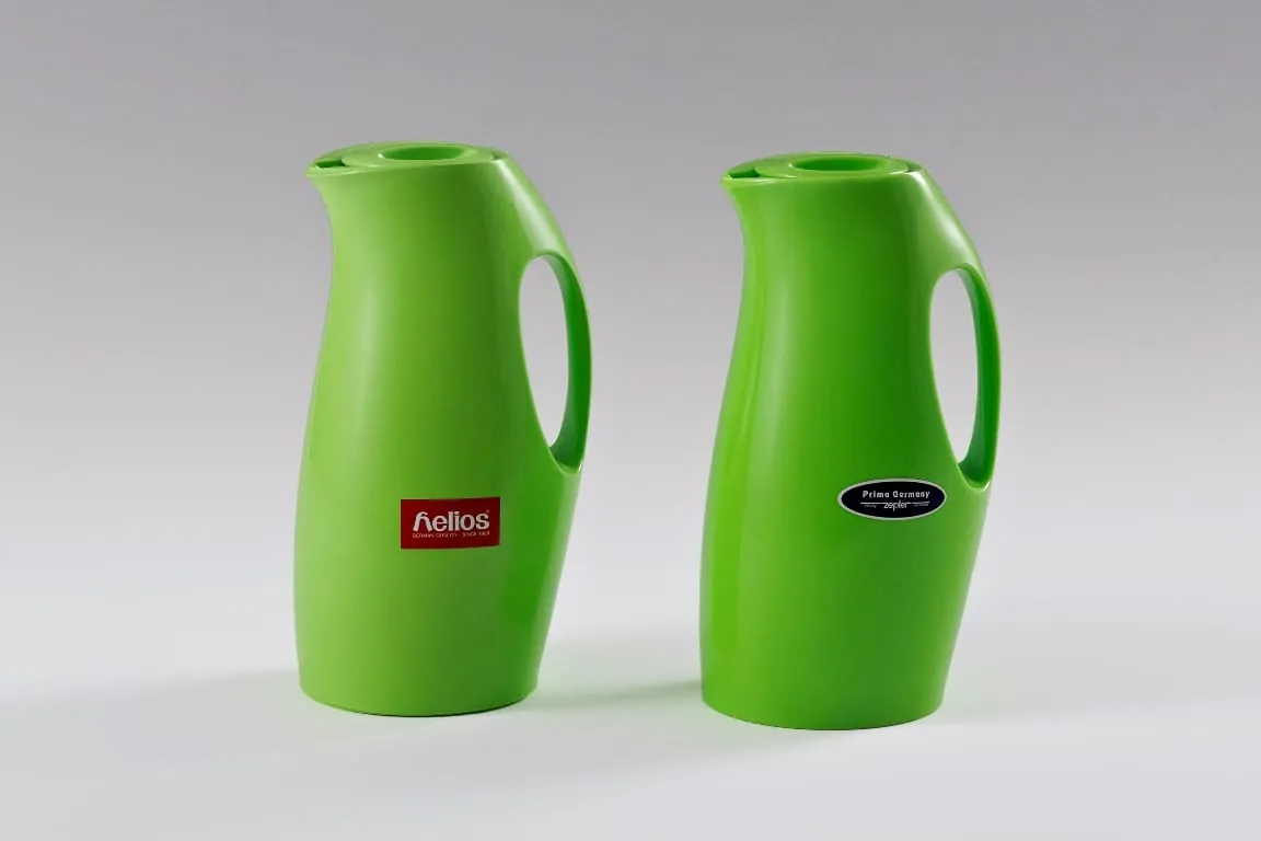 Links die Isolierkanne „Ciento“ von Helios Dr. Bulle, rechts die Fälschung aus den Vereinigten Arabischen Emiraten. Besonders dreist: Der Nachahmer kopiert das Design der Isolierkanne „Ciento“ von Helios, vertreibt diese Kopie aber weder unter eigener Marke noch unter „Helios“, sondern benutzt illegal die Schweizer Marke „Zepter“ der Firma Zepter International. Er kombiniert also das Design einer renommierten Firma mit der Marke einer anderen bekannten Firma. Zudem besteht keine Verbindung zwischen „Zepter“ und „Prima Germany“. Wer sich hinter „Prima Germany“ verbirgt ist unbekannt.