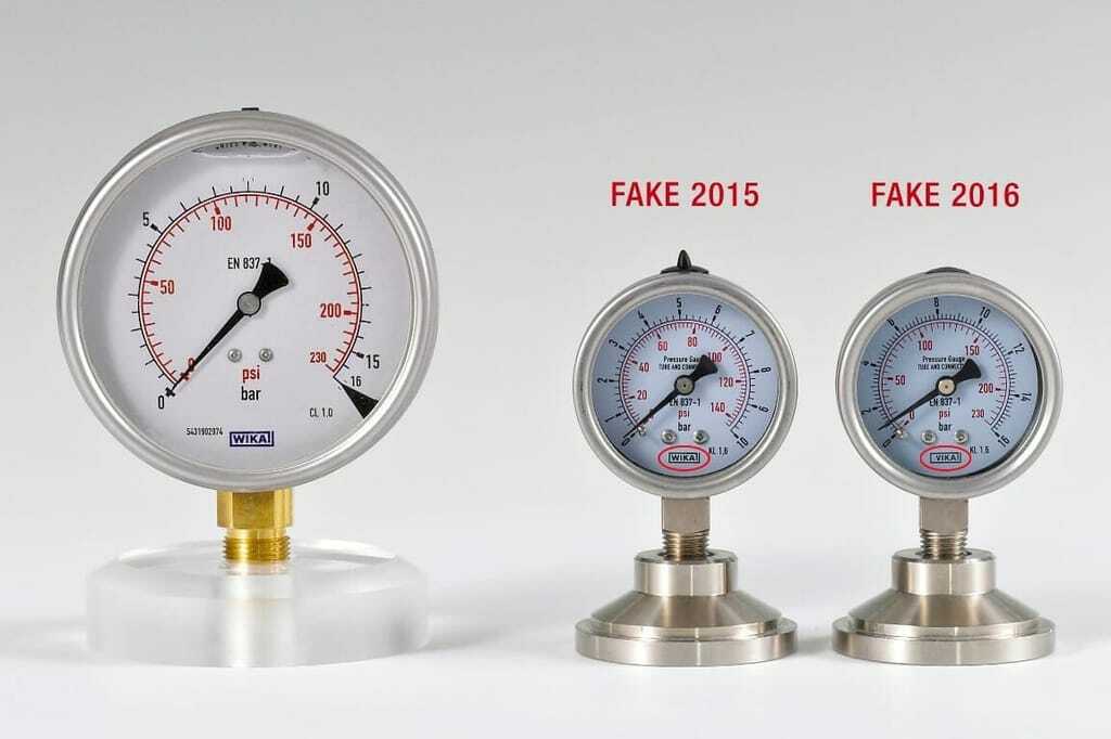 Druckmessgerät von WIKA (li.) und chinesische Fälschung der Ma Anshan Exact Instrument Co. Ltd.. Besonders dreist: Nach einer Razzia 2015 tauschte man einfach das WIKA-„W“ durch ein „V“ aus. – © Aktion Plagiarius e.V.