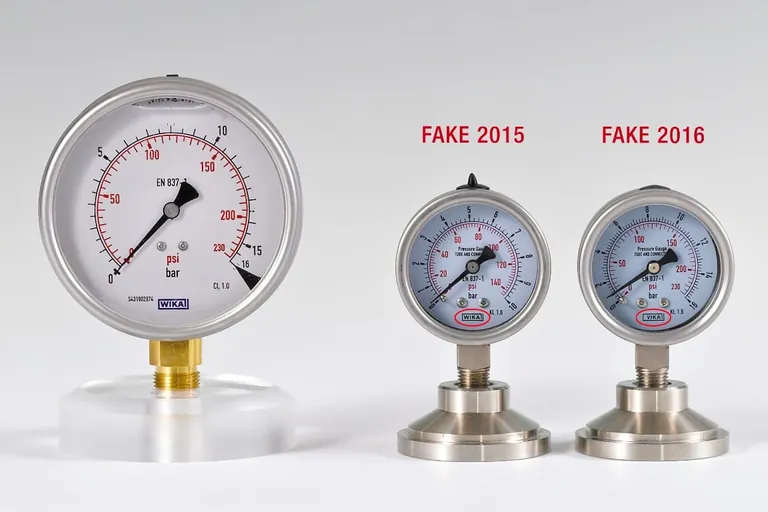 3. Preis 2017: Druckmessgerät von WIKA (li.) und chinesische Fälschung der Ma Anshan Exact Instrument Co. Ltd.. Besonders dreist: Nach einer Razzia 2015 tauschte man einfach das WIKA-„W“ durch ein „V“ aus.