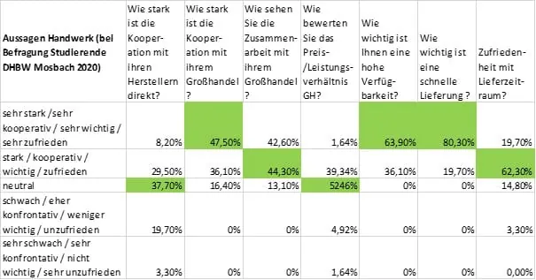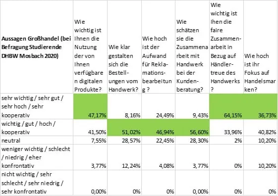 Gerade ein Spezialist hat zudem auch noch die Chance sich direkt mit einem Hersteller zu vernetzen, dessen Produkte er verarbeitet und darüber gute Preise im Einkauf zu erzielen, auch durch seine Mengen, was die Marge treibt. Bei der Befragung des Handwerks wird sehr deutlich, dass das Handwerk deutlich stärker mit dem Großhandel (48 % sehr stark) als direkt mit dem Hersteller (8 % sehr stark) zusammenarbeitet, wobei der Spezialist hier die Ausnahme bildet (einzelner Hersteller als Lieferant von Know-how und Material) – siehe Tabelle „Aussagen Handwerk“.