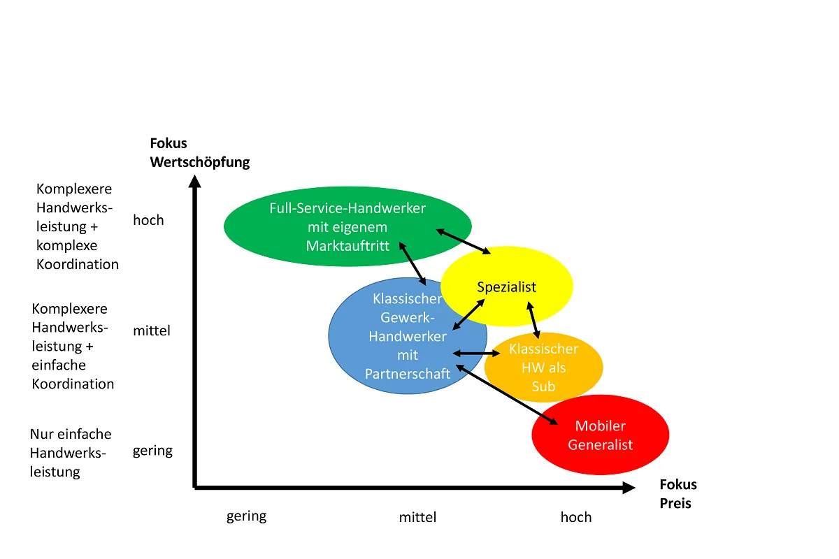 Es gibt 5 Typen von Handwerksbetrieben. Typ 1: Der „mobile Generalist“, Typ 2: Der Handwerker als „Subunternehmer“, Typ 3: Der Spezialist, Typ 4: Der (gewerkorientierte) (Klein-) Handwerker, Typ 5: der Fachhandwerker mit eigenem Marktauftritt als Generalunternehmer / Full-Service-Partner für Kunden.