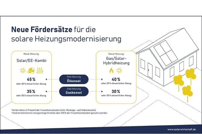 Seit Januar 2021 hat die Bundesregierung sämtliche Förderungen für energieeffiziente Gebäude und klimafreundliche Heizungen in der neuen Bundesförderung für effiziente Gebäude (BEG) zusammengeführt. Die im vergangenen Jahr deutlich angehobenen Fördersätze behalten ihre Gültigkeit. Wird beispielsweise eine bestehende Heizungsanlage mit einer Solarthermie-Anlage nachgerüstet, erhält der Betreiber einen Zuschuss von 30 % der förderfähigen Kosten. Wird ein alter Ölkessel gegen eine effiziente Gas-Solar-Heizung getauscht, winkt eine Förderung von 40 % der Anschaffung und Installationskosten (vgl. auch beiliegende Grafik). Gleichzeitig dürfte die Nutzung fossiler Energieträger immer teurer werden, als Folge jährlich steigender CO2-Mindestpreise.