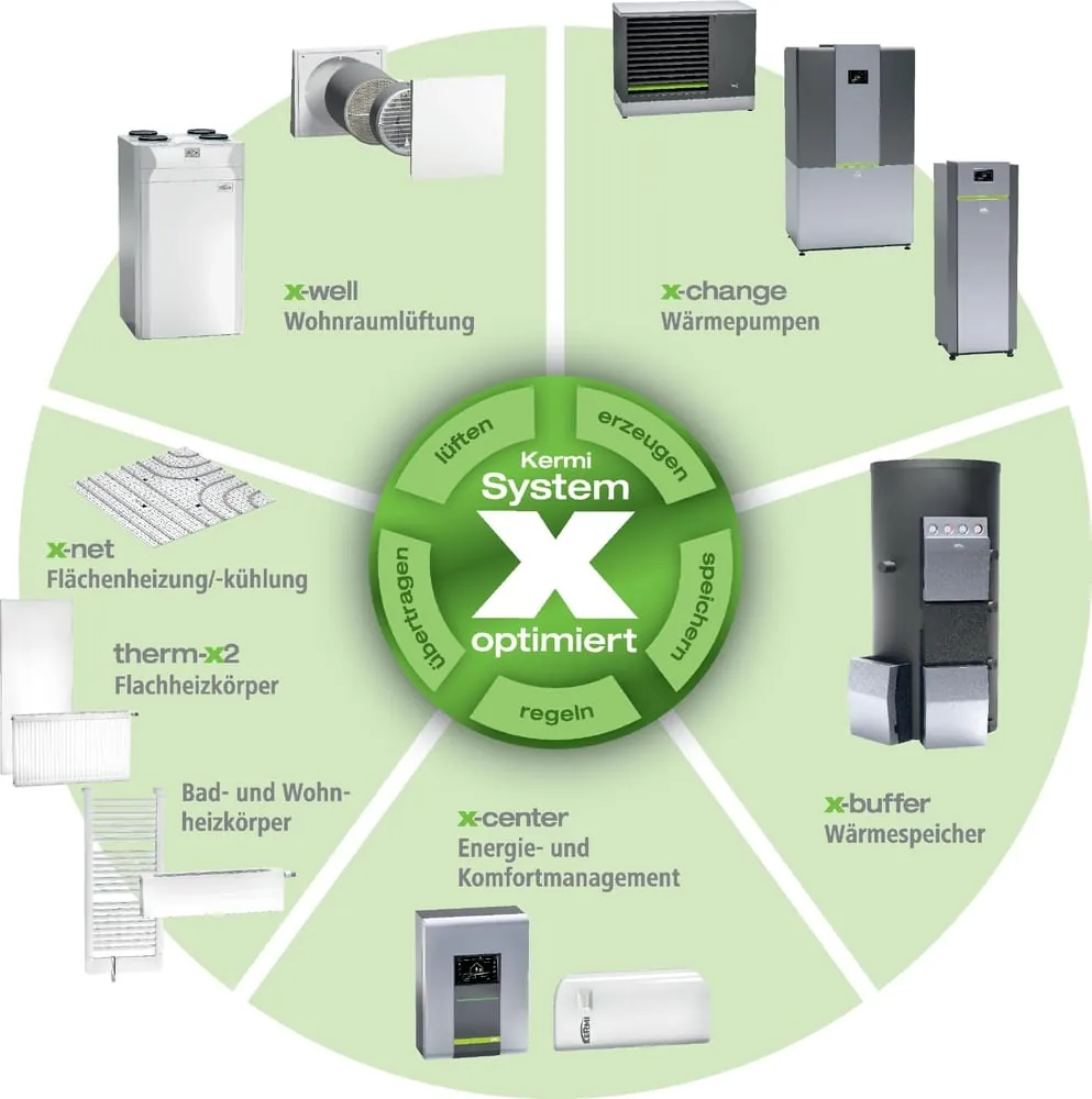Mit dem System x-optimiert bietet Kermi eine Lösung für Wärme- und Lüftungstechnik – mit hohem Energieeinsparungspotenzial und Komfort. Das System umfasst die Segmente der Wärmeerzeugung, -speicherung und -übertragung, Wohnraumlüftung sowie smarte Regelungstechnik. Damit nimmt der Hersteller laut eigenen Angaben eine Vorreiterrolle in der Branche ein. Alle Komponenten sind aufeinander abgestimmt und sicher bei Planung, Installation und Funktion im täglichen Einsatz, heißt es.
