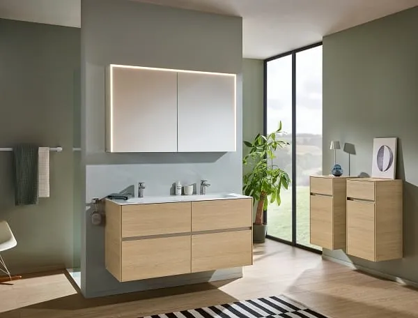 In der Fachhandelsliste 2023 sind die aktuellen Sets übersichtlich zusammengestellt. Neu ist das Möbelset Ready, das filigrane Keramik mit hochwertigen, geradlinigen Möbeln kombiniert. Ergänzt werden die Sets wahlweise mit einem LED-Spiegel mit zwei vertikalen Lichtausschnitten oder einem LED-Spiegelschrank im völlig neuen Design. Der Spiegelschrank hat einen seitlich verspiegelten Korpus und eine umlaufende LED-Beleuchtung (seitlich und oben) mit einer frei einstellbaren Lichtfarbe von Warmweiß zu Kaltweiß. Innen ist dieser mit Glasfachböden sowie einer Doppelsteckdose ausgestattet. Für mehr Stauraum sind Beimöbel wie Seitenschränke und Hochschränke separat bestellbar.