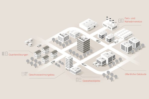 Eine Dekarbonisierung im großen Stil schaffen Quartierslösungen und Nahwärmenetze. Ein Beispiel sind Großwärmepumpen, die in heterogen strukturierten Stadtvierteln Synergien schaffen können.