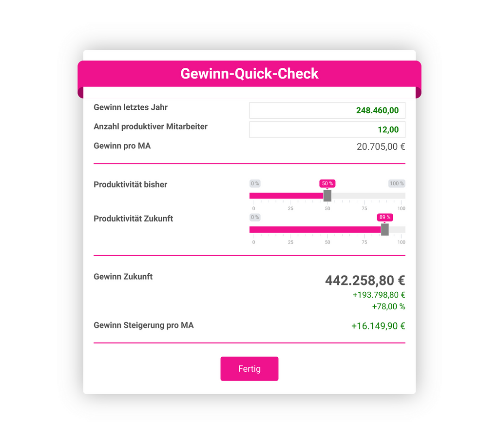 Eine erste Sofort-Einschätzung ermöglicht der Gewinn-Quick-Check zur Berechnung der Gewinnsteigern pro Mitarbeiter. Das schrittweise Verfahren unterteilt die Analyse mittels Kategorien in kleine leicht zu bewältigende Einheiten. Mittels künstlicher Intelligenz (KI) werden Vorschläge erzeugt und automatisch in ein Aufgabenboard und Ticket übertragen. Eine Checkliste und Lernvideos unterstützen den Prozess der Umsetzung.
