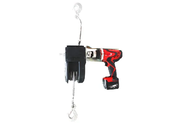 Die Profi Akku-Seilwinde T15 ist ausgelegt für Lasten bis 100 kg, die problemlos auf Höhen bis 15 m gehoben werden können. Das Kunstoffseil ist extrem widerstandsfähig und bietet eine Sicherheitsreserve von Faktor 10. Der Sicherungshaken ist zugelassen auf 500 kg.