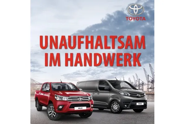„Unaufhaltsam im Handwerk“ heißt die gemeinsame Aktion von Toyota und SDH, die bis zum 31. Dezember 2017 für die Modelle Proace, Hilux, RAV4, Auris und Auris Touring Sport gilt. Den mit 32 % höchsten Rabatt bekommen Handwerksbetriebe beim Toyota Proace, der sich laut Hersteller aufgrund seiner Vielfältigkeit und Lademöglichkeiten besonders für schwere, sperrige Transporte durch enge Großstädte eignet. Einen Preisnachlass von 19 % wird Handwerkern beim Kauf eines Toyota-Hilux in Aussicht gestellt. Darüber hinaus werden Rabatte für den RAV4 und Auris sowie auf ihre Hybrid-Varianten angeboten, heißt es aus München.