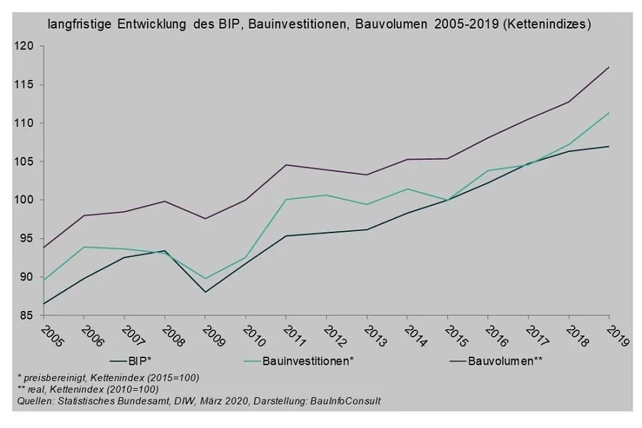 Um hier realistische Prognosen abgeben zu können, müssen zuerst einige grundlegende Annahmen analysiert werden. Ohne zu sehr auf die makroökomischen Machanismen und Dynamiken im Detail einzugehen, lässt sich an dieser Stelle vereinfacht folgendes festhalten: Die zentralen bauwirtschaftlichen Indikatoren – wie etwa die Bauinvestitionen oder das Bauvolumen – sind langfristig an die Entwicklung des Bruttoinlandsprodukts (BIP) gekoppelt.
