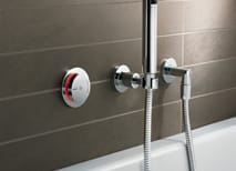 Viega setzt mit der Wandversion der Multiplex Trio E das Konzept der elektronisch gesteuerten Badewannenarmaturen fort. Die Multiplex Trio E ist eine vollautomatisch arbeitende Armatur, bei der sich die Wassermenge und die gewünschte Temperatur vorab festlegen lassen. Die Bedieneinheit lässt sich im Wannenrand oder nun auch unter Putz installieren. Füllhöhe und Wassertemperatur werden voreingestellt, abgespeichert und dann bei Bedarf abgerufen. Der Zulauf stoppt automatisch beim Erreichen des gewählten Füllstandes. Durch eine Memory-Funktion kann sich die Armatur die Werte von drei Nutzern merken. Die aktuellen Werte werden durch einen Leuchtring am Bedienelement in Form von Farbe und Intensität angezeigt.