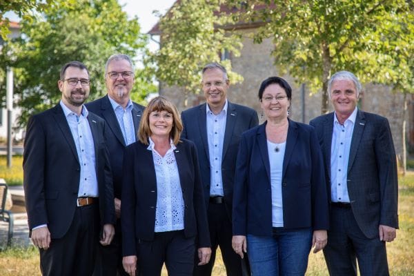 Systemair GmbH, Geschäftsleitung: Benjamin Klasen wurde herzlich willkommen geheißen im Team der Systemair-Prokuristen, bestehend nun aus (von links nach rechts) Benjamin Klasen, Walter Rudolf, Elke Landwehr, Geschäftsführer Stefan Fischer, Elke Rehmet und Geschäftsführer Kurt Maurer. – © Systemair GmbH